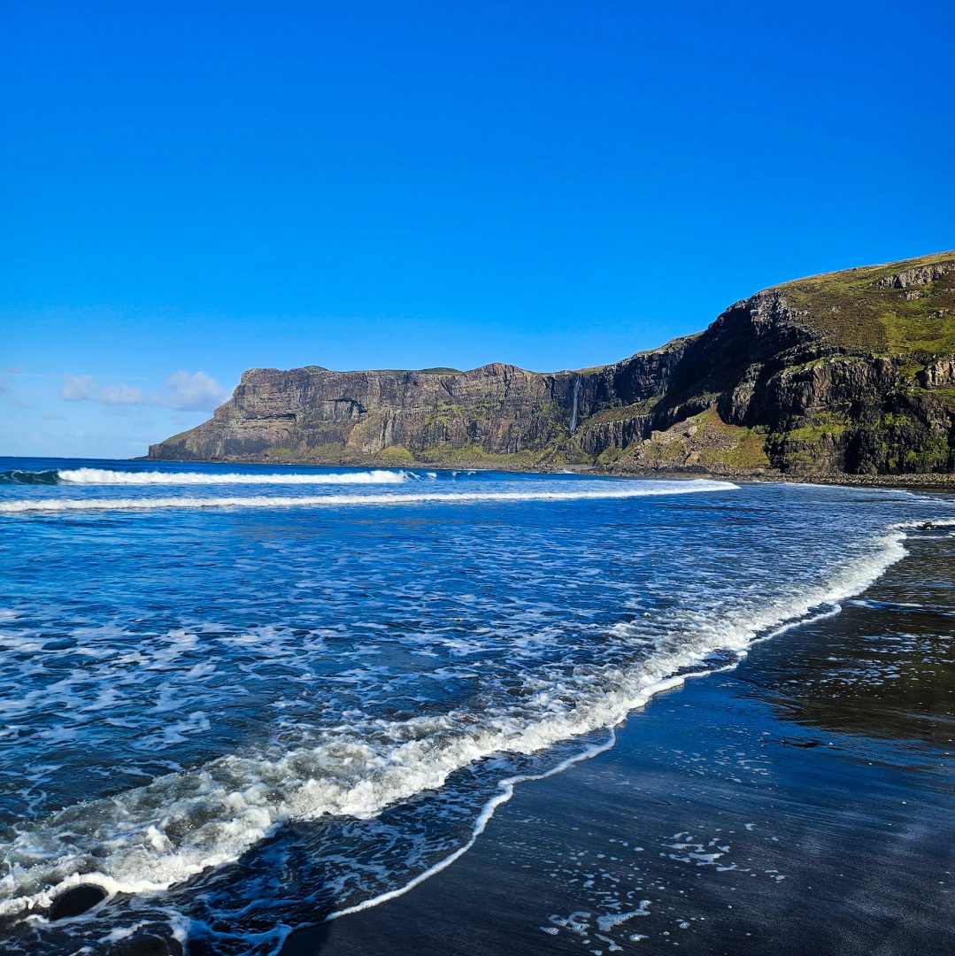 As you descend the steps through the trees, you’ll hear it before you see it. The woods are impossibly green and a world away from the usual open, sweeping vistas on Skye. On calm days, the pool beneath it is a popular swimming spot, but if you visit during or after rain, it becomes a thunderous spectacle!